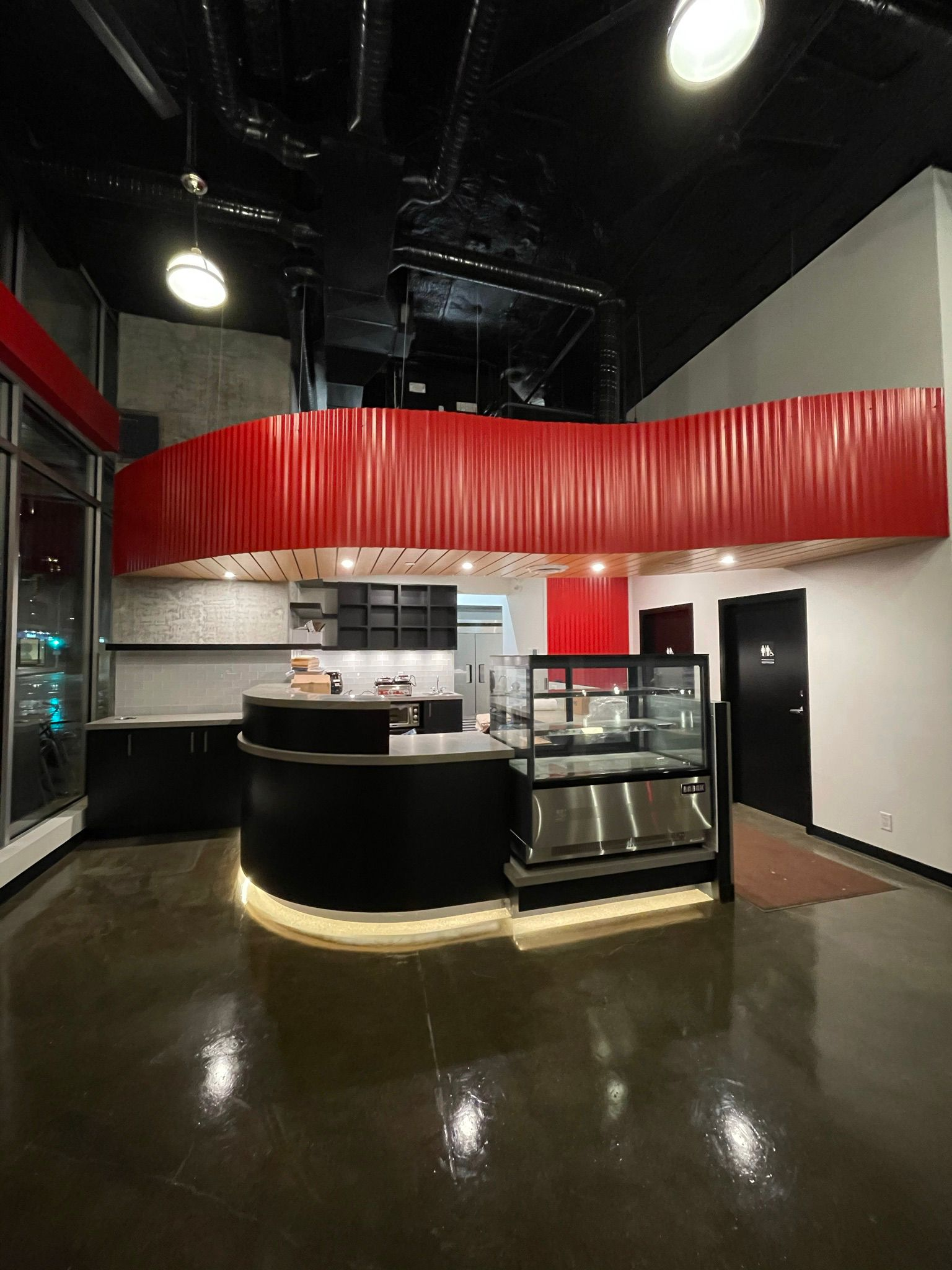 Another coffee shop, we sprayed the ceiling and finished the walls and did a concrete prep and clear epoxy finish.