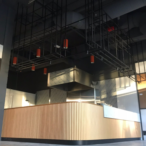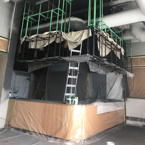 Uncle Fatih’s pizza place, we sprayed the open ceiling concept and finished the walls.