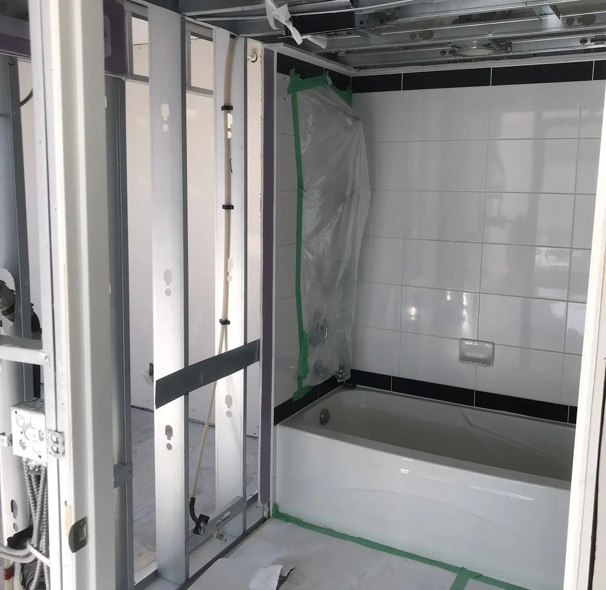 Restoration project after water leak, new drywall installation with drywall finishing and paint.